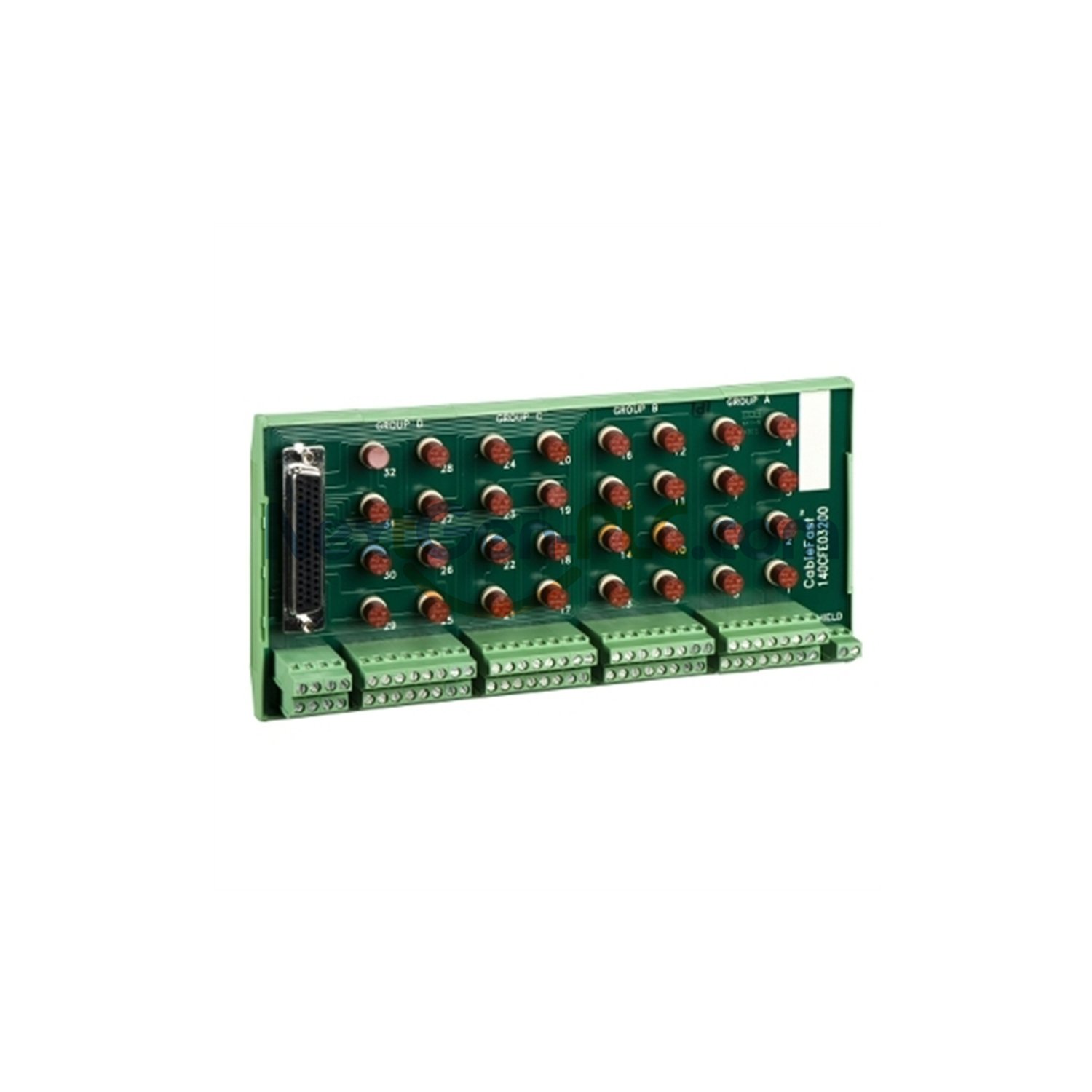 The 140CFE03200 is a specialized CableFast terminal block from Schneider Electric designed for the Modicon Quantum automation platform. This accessory provides secure and protected connections for digital output modules in industrial control systems. Each of the 32 output points features individual fuse protection to safeguard your equipment.